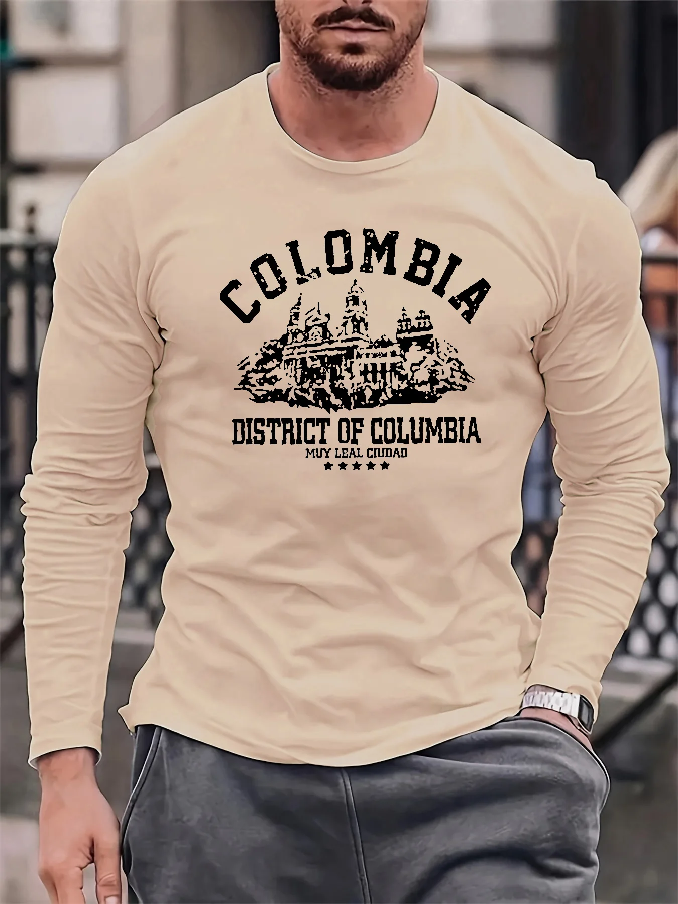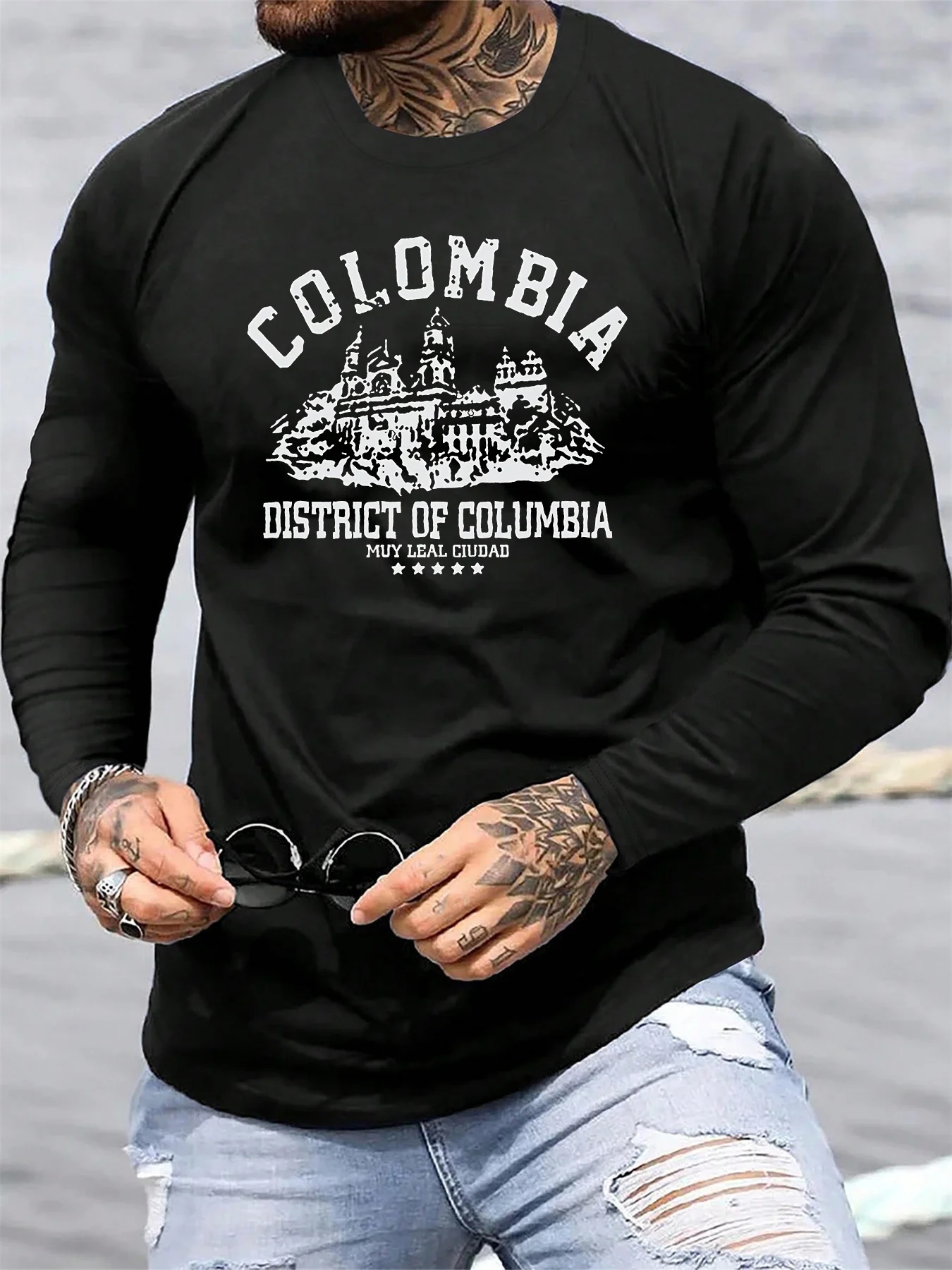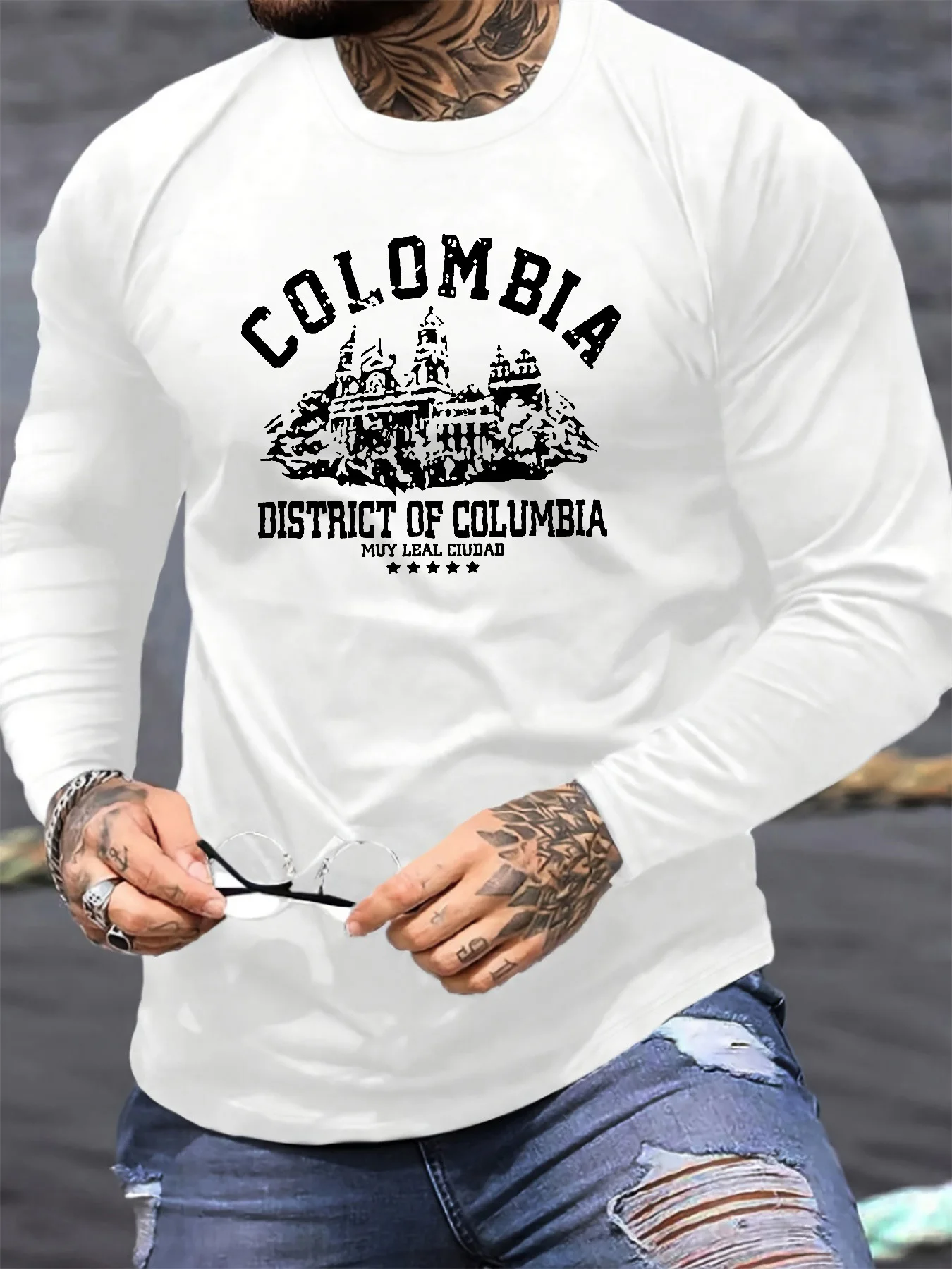 100% cotton men's long sleeved round neck loose Colombian architectural pattern print autumn/winter casual versatile T-shirt top