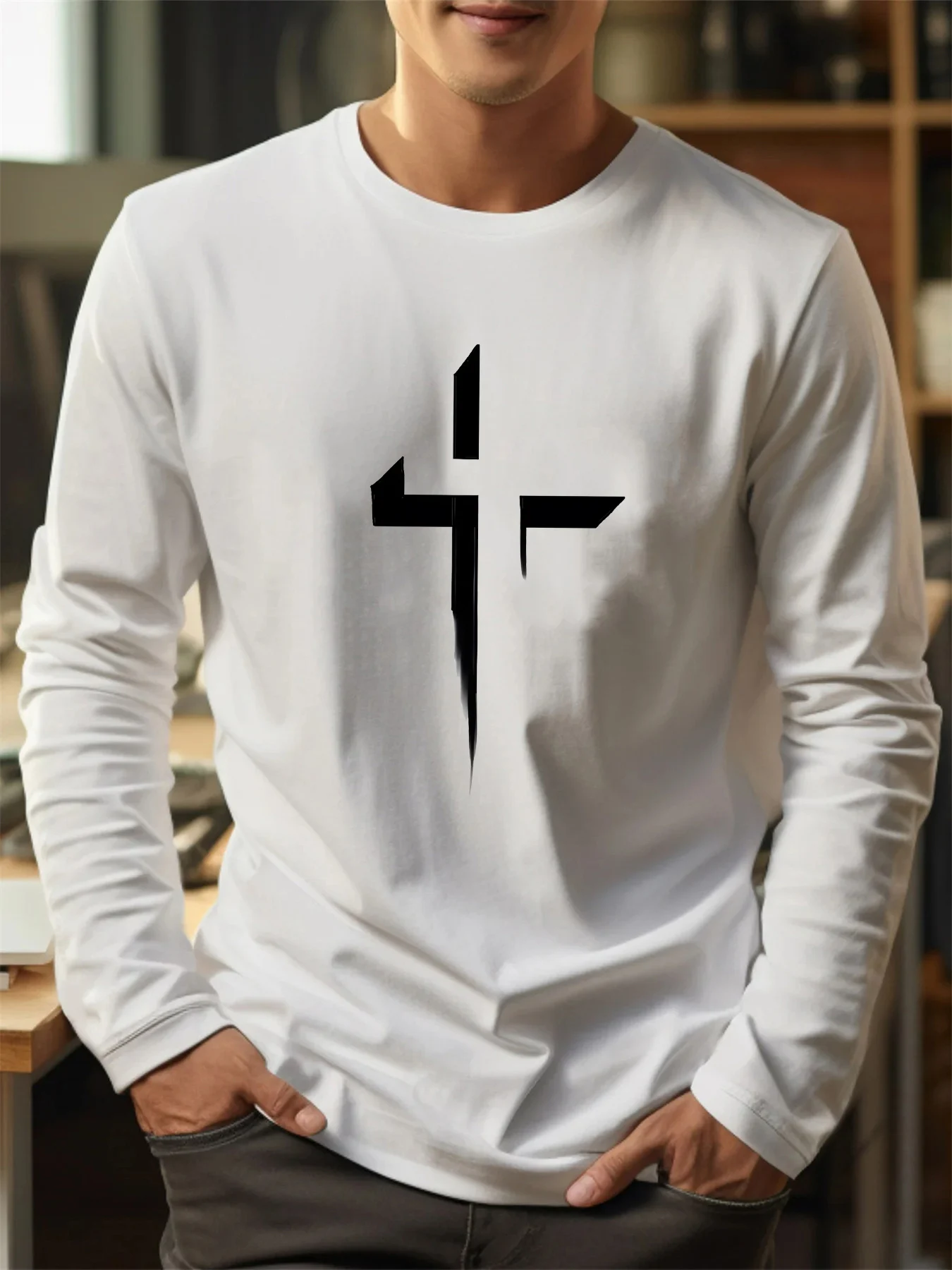 100% pure cotton men's long sleeved round neck loose casual cross pattern printed spring and autumn versatile T-shirt top